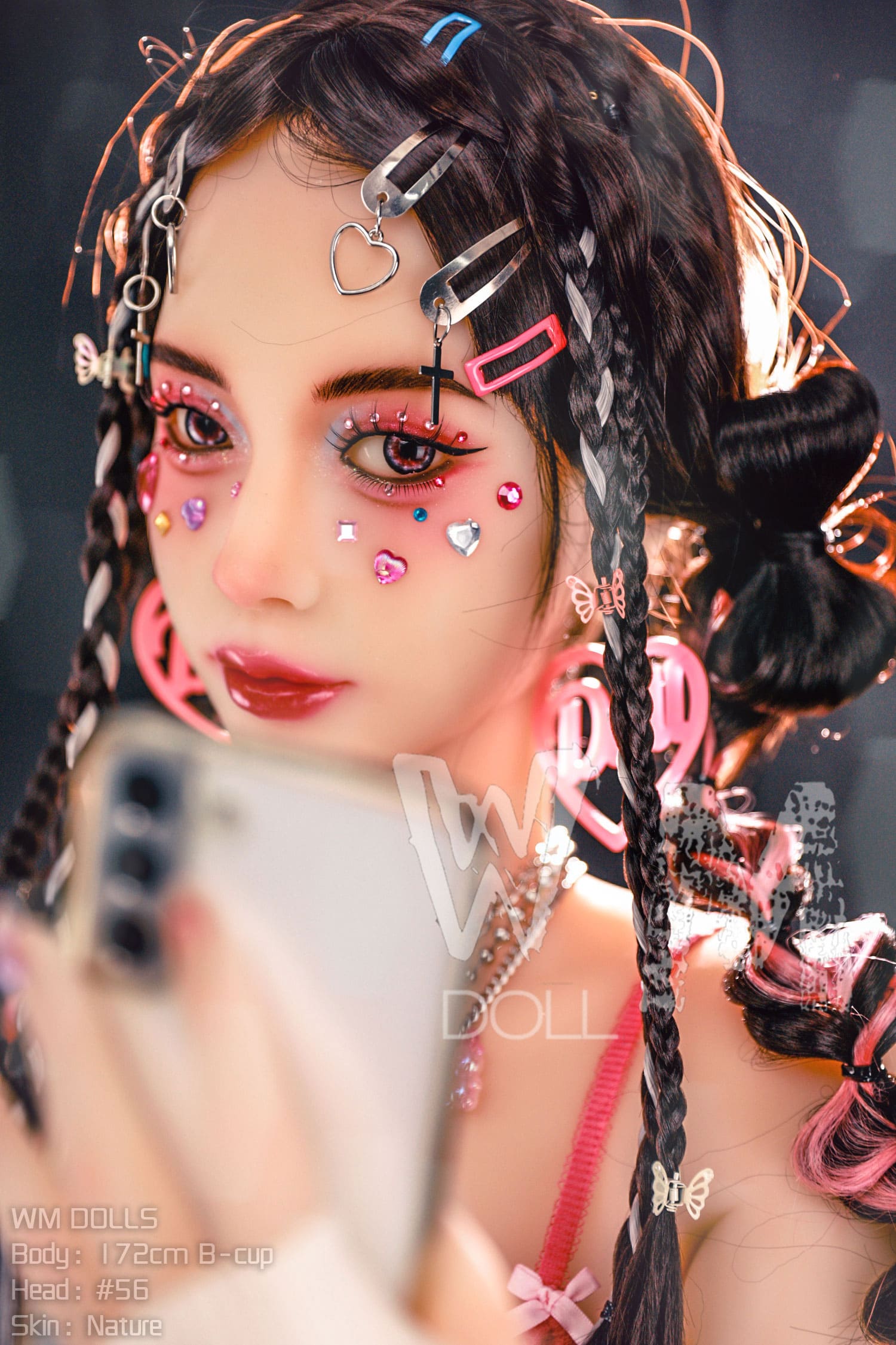 洗練されたメイクにハートとラインストーンを組み合わせます。ぬいぐるみのような幻想的な雰囲気を演出します。編み込みの造形とアクセサリーの細部が豊富で、独特のクールな少女スタイルを呈します。